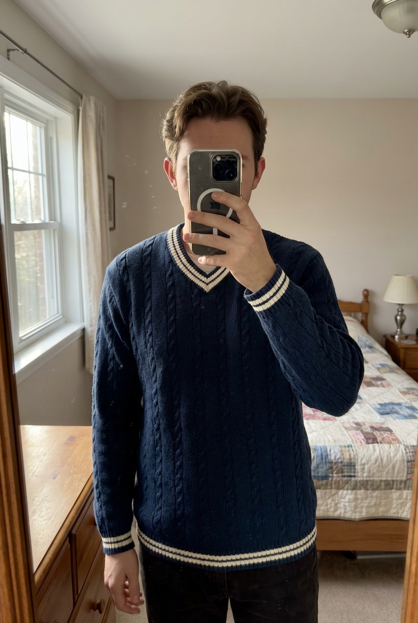 Pull Col V Fait Main Tricot Aran Wool Sweater 100% Coton Bleu Marine Victor lazlo XL debout, face à la caméra, dans une chambre à la lumière douce, avec une lumière naturelle filtrant par la fenêtre.