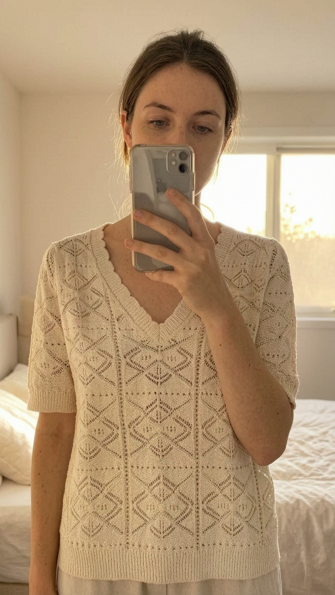 Pull crochet mango M - Maglione maniche Corte mango M in piedi, rivolto verso la fotocamera, in una camera da letto con luce soffusa e luce naturale che filtra dalla finestra.