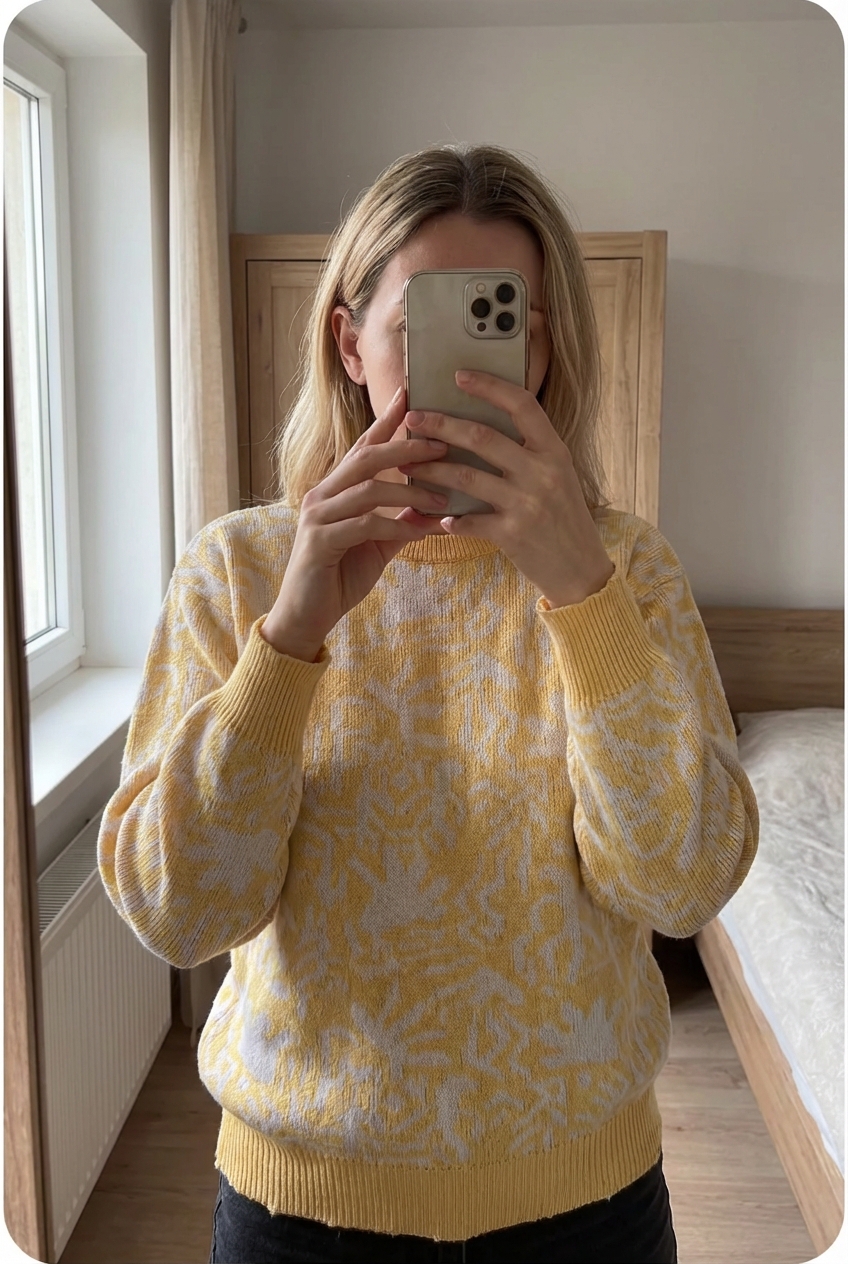 Pull d'Hiver Vintage Année 90 Wool 90'Sweater En Laine Jaune L debout, face à la caméra, dans une chambre à la lumière douce, avec une lumière naturelle filtrant par la fenêtre.
