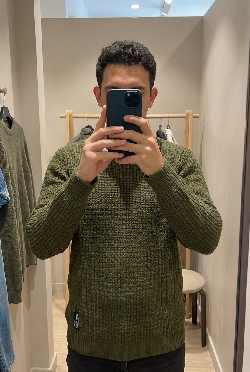 Une personne en Pull en maille vert CKN Clockhouse – Taille XL debout, face à la caméra, dans une cabine d’essayage de style boutique avec un miroir et une décoration neutre.