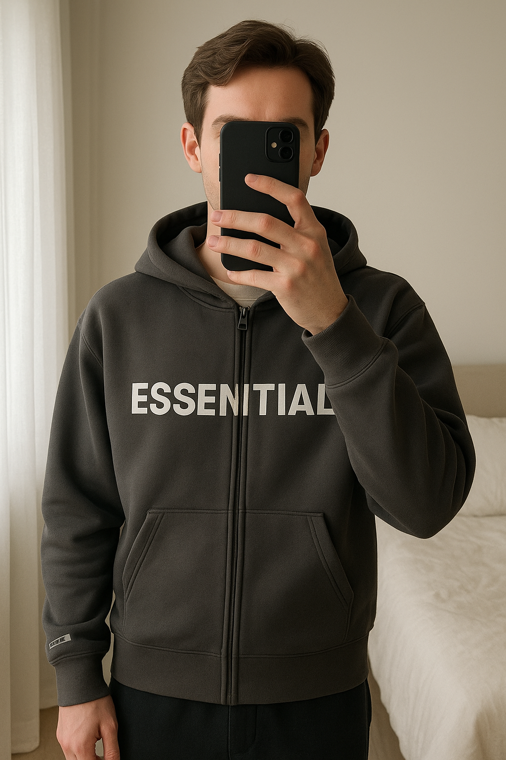 Pull Essentiel debout, face à la caméra, dans une chambre à la lumière douce, avec une lumière naturelle filtrant par la fenêtre.