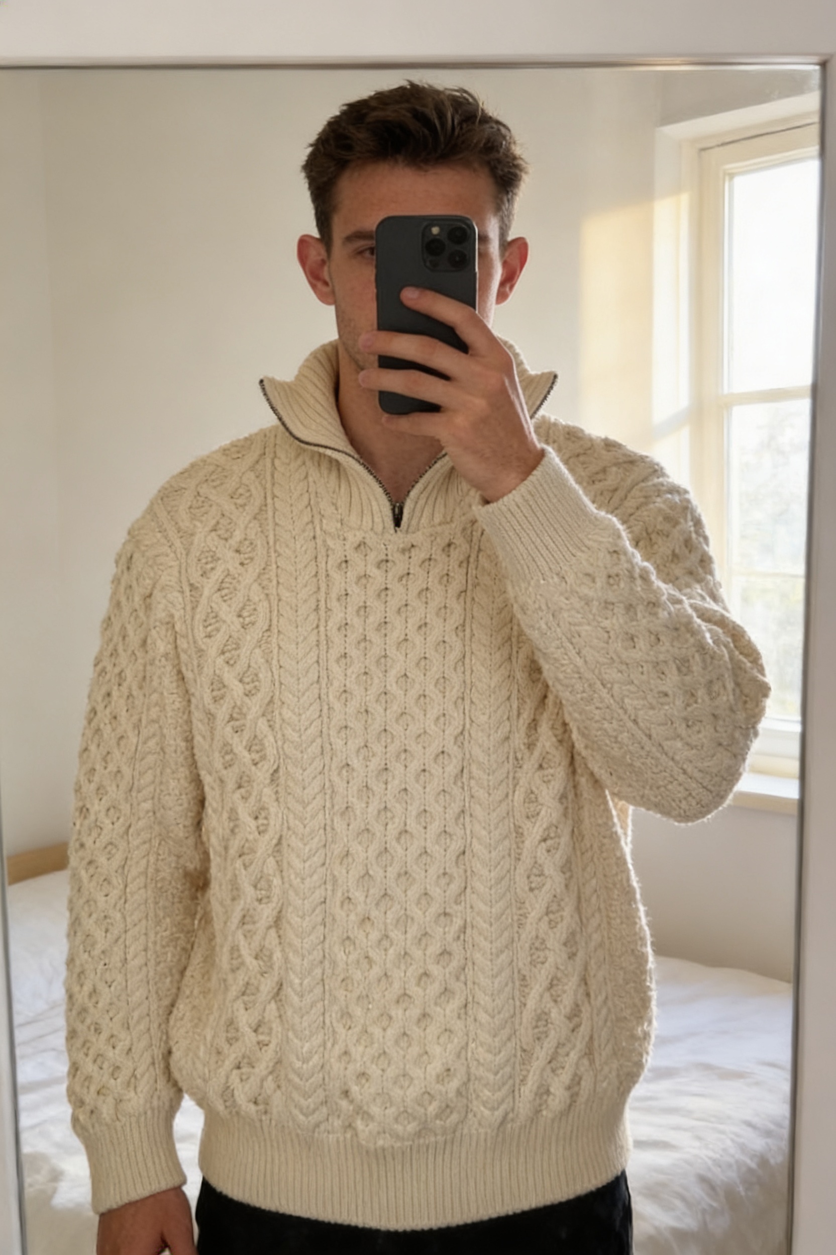 Pull Fait Main Tricot Aran Wool Sweater 100% Laine Beige Crème Aran Crafts XL debout, face à la caméra, dans une chambre à la lumière douce, avec une lumière naturelle filtrant par la fenêtre.