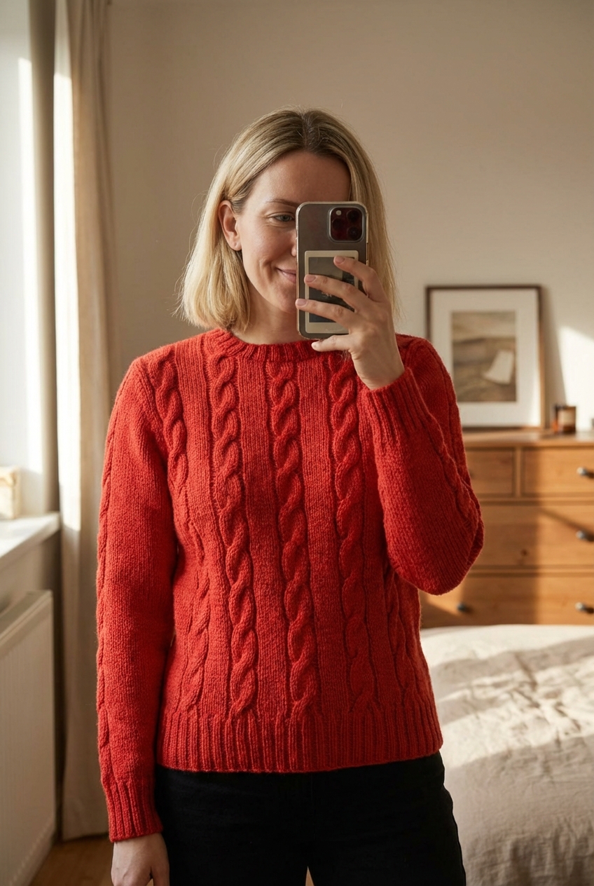 Pull Fait Main Tricot Torsadé Aran Wool Sweater 100% Laine Rouge Orange Aran Craft M debout, face à la caméra, dans une chambre à la lumière douce, avec une lumière naturelle filtrant par la fenêtre.