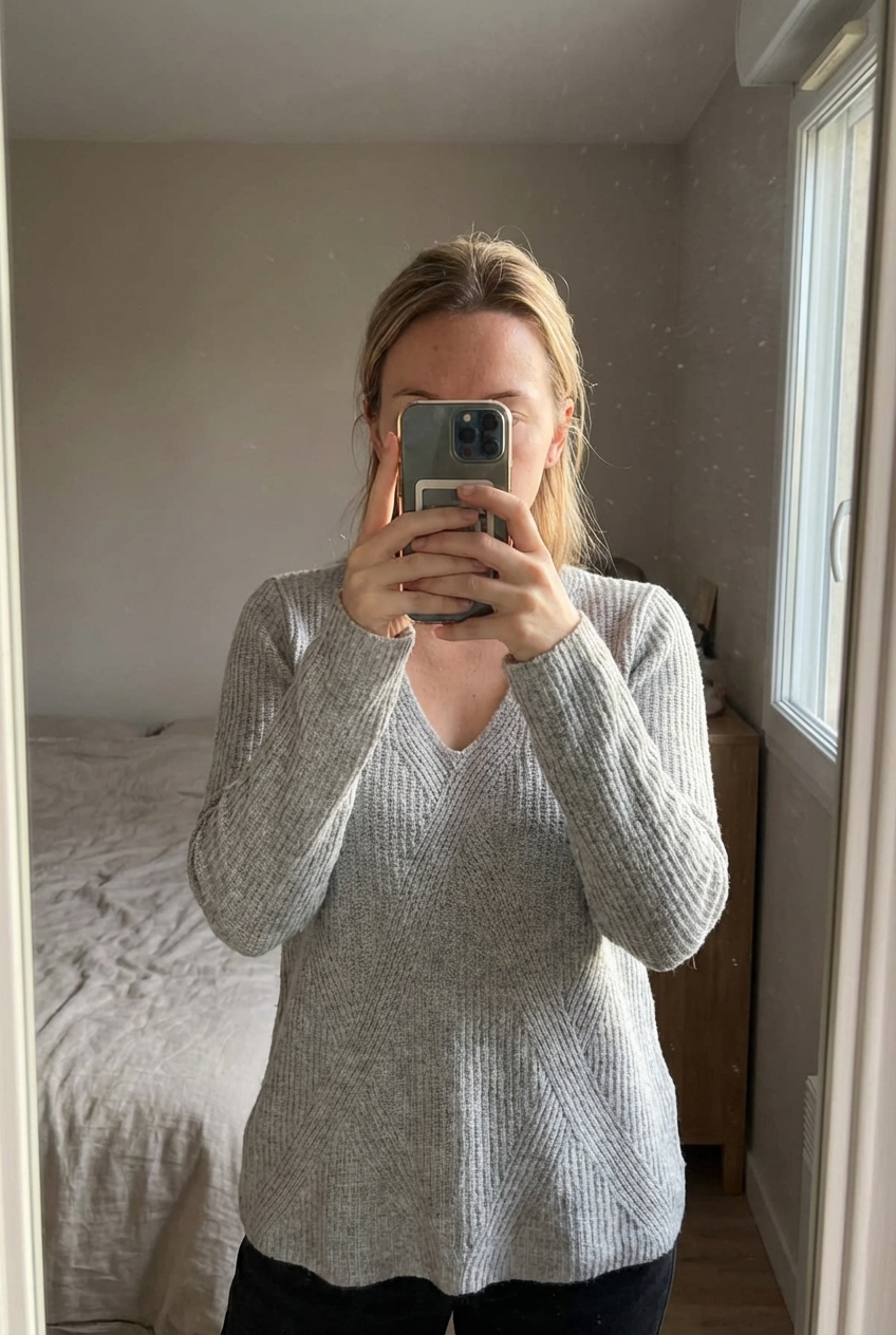 Une personne en Pull femme en maille debout, face à la caméra, dans une chambre à la lumière douce, avec une lumière naturelle filtrant par la fenêtre.