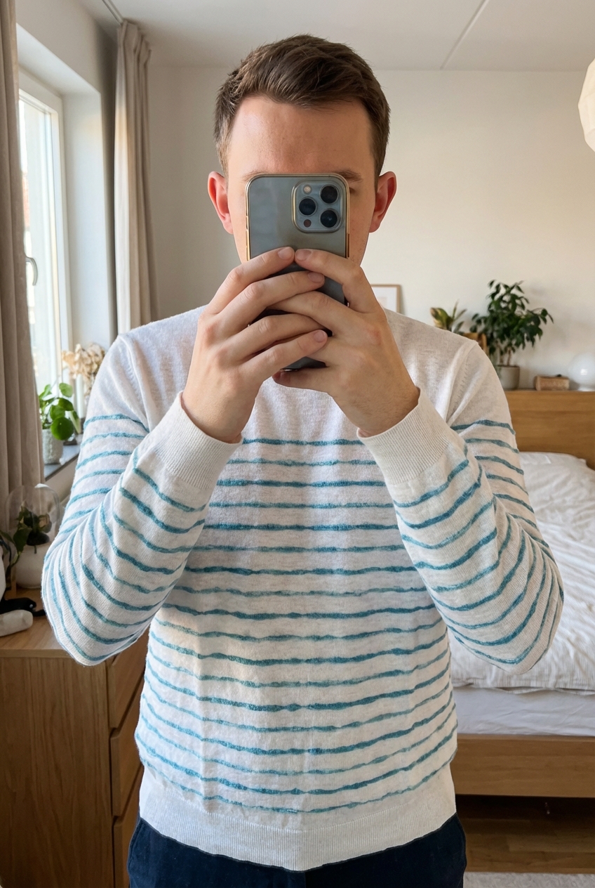 Pull fin IKKS Taille M Comme Neuf debout, face à la caméra, dans une chambre à la lumière douce, avec une lumière naturelle filtrant par la fenêtre.