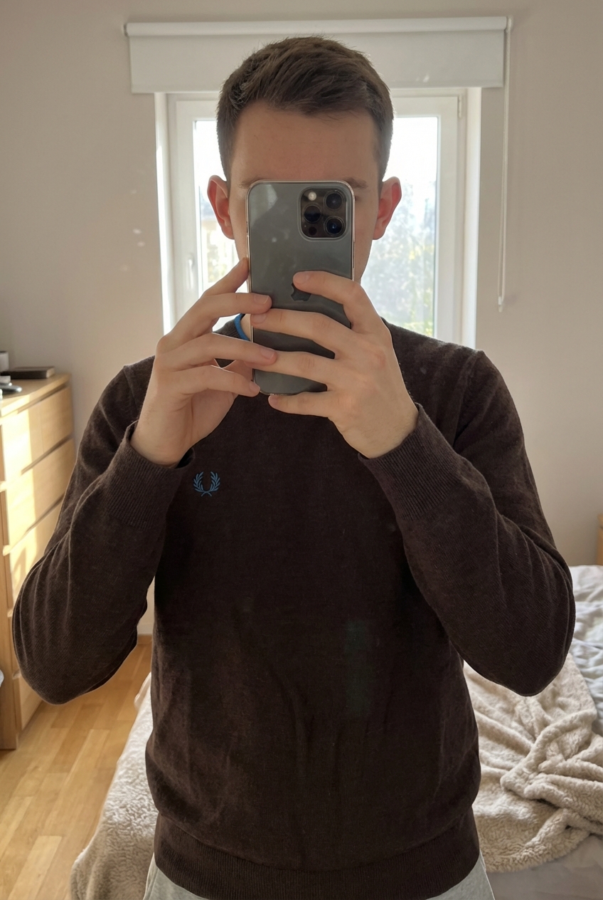 pull Fred Perry debout, face à la caméra, dans une chambre à la lumière douce, avec une lumière naturelle filtrant par la fenêtre.