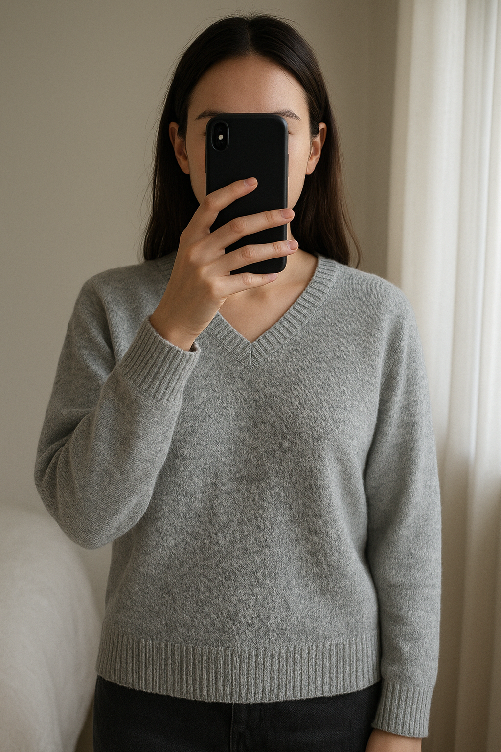 Pull gris clair col V – Taille L debout, face à la caméra, dans une chambre à la lumière douce, avec une lumière naturelle filtrant par la fenêtre.