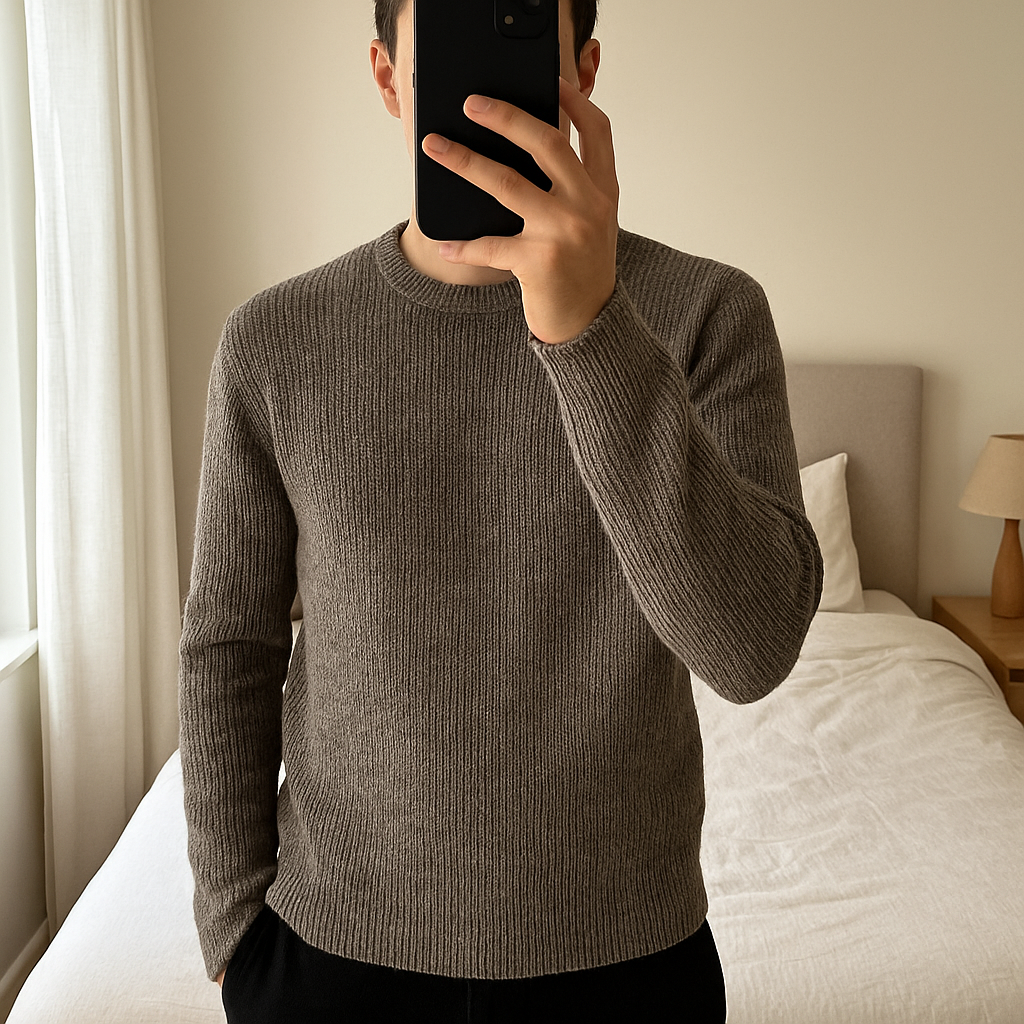Pull hiver gris h&m homme M - Maglione uomo h&m in piedi, rivolto verso la fotocamera, in una camera da letto con luce soffusa e luce naturale che filtra dalla finestra.