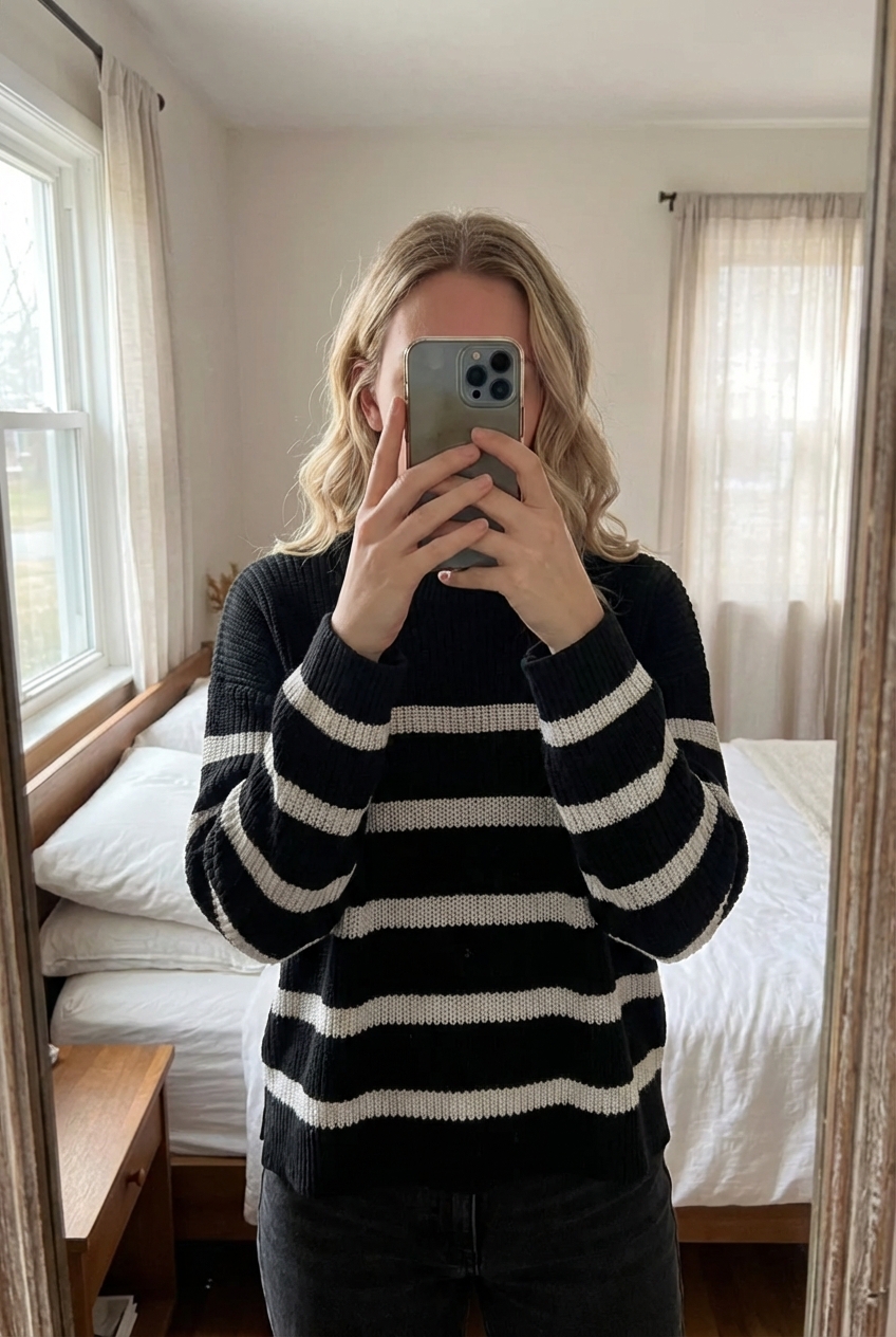 Una persona in Pull hiver à rayures femme L H&M - Maglione inverno donna L in piedi, rivolto verso la fotocamera, in una camera da letto con luce soffusa e luce naturale che filtra dalla finestra.