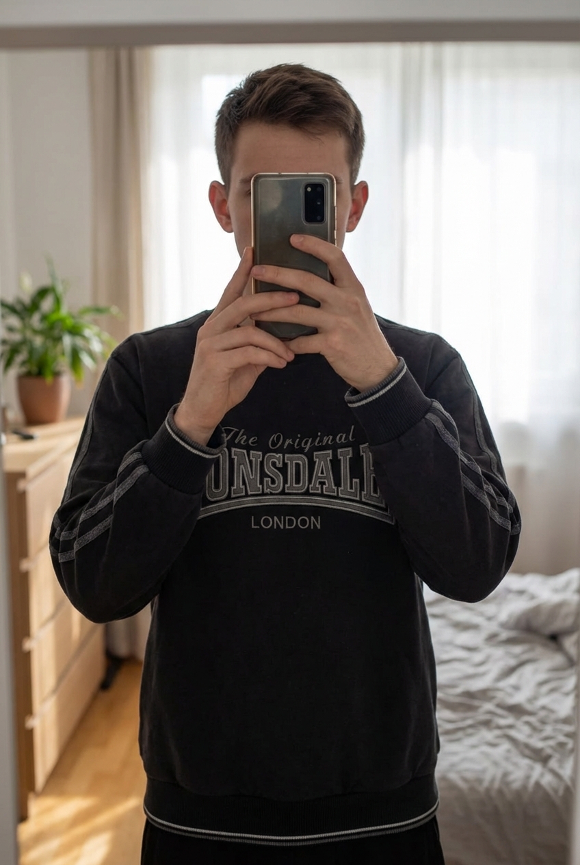pull lonsdale debout, face à la caméra, dans une chambre à la lumière douce, avec une lumière naturelle filtrant par la fenêtre.