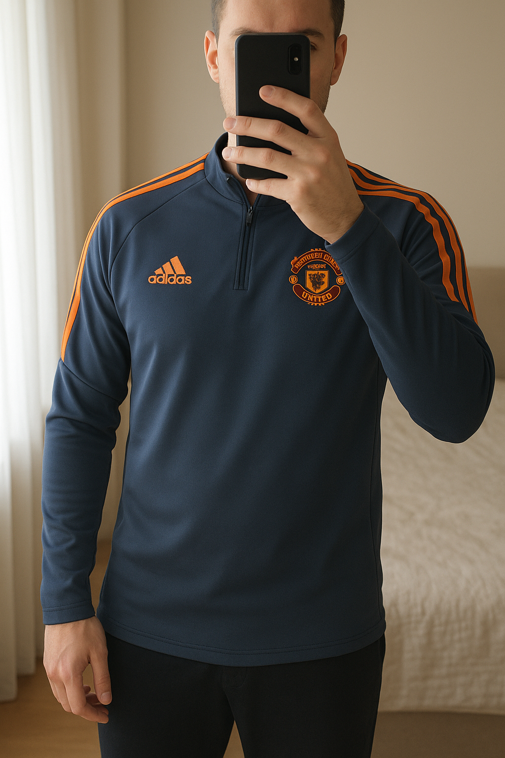 Pull man united debout, face à la caméra, dans une chambre à la lumière douce, avec une lumière naturelle filtrant par la fenêtre.