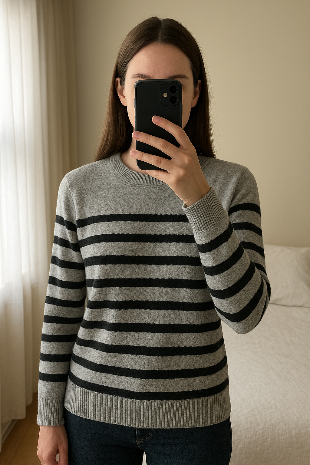 Pull marinière tendance cachemire et soie C&JO taille XXL debout, face à la caméra, dans une chambre à la lumière douce, avec une lumière naturelle filtrant par la fenêtre.