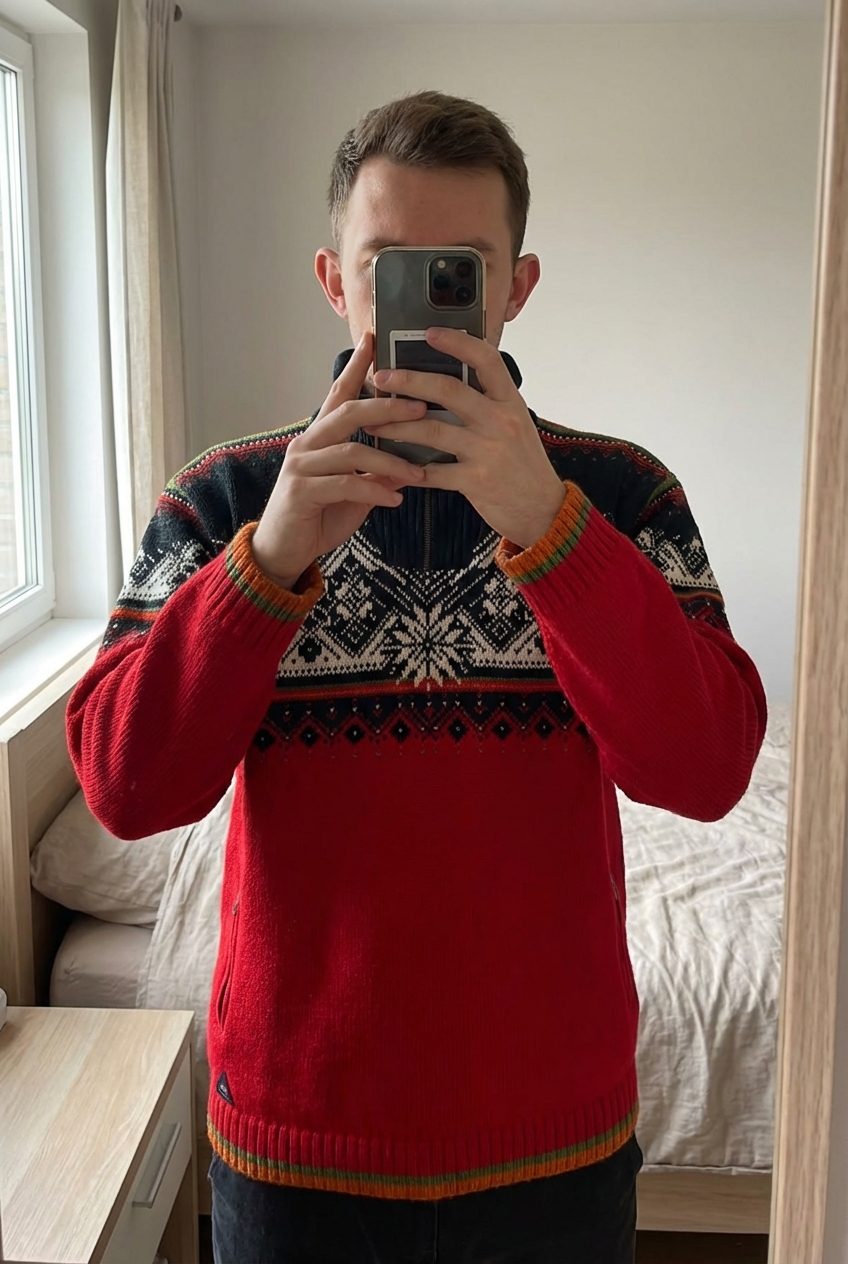 Pull Nordique Norvegian Sweater Dale Of Norway St moritz 2003 Fait Main Tricot 100% Laine Rouge XL debout, face à la caméra, dans une chambre à la lumière douce, avec une lumière naturelle filtrant par la fenêtre.