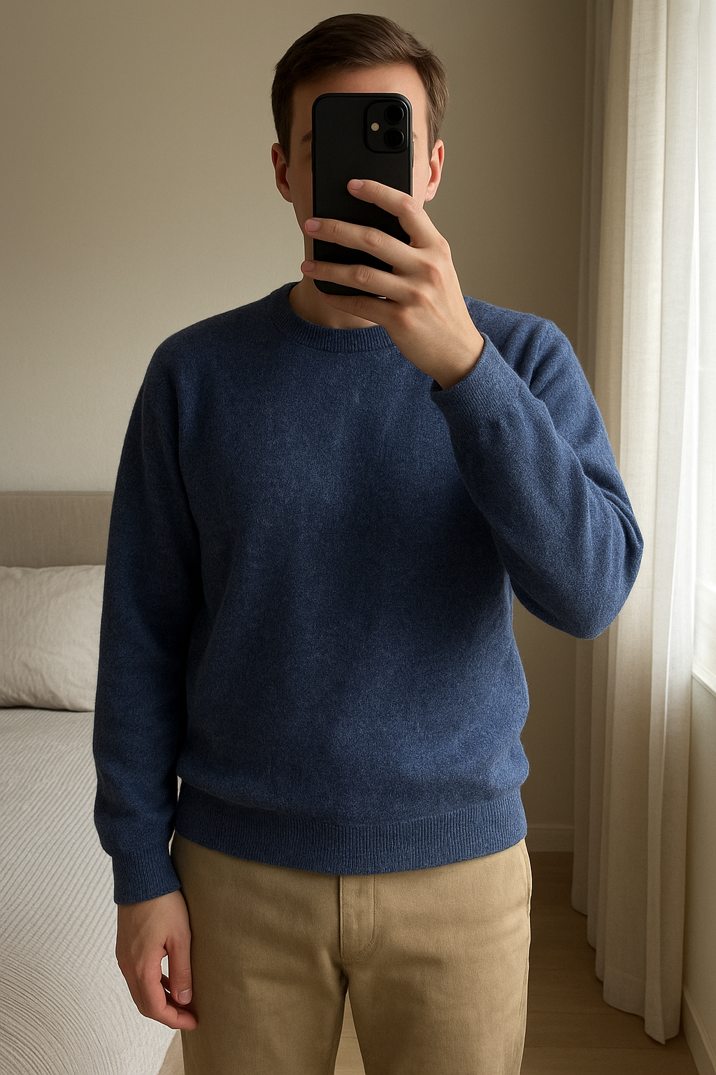 Pull over Size bleu debout, face à la caméra, dans une chambre à la lumière douce, avec une lumière naturelle filtrant par la fenêtre.