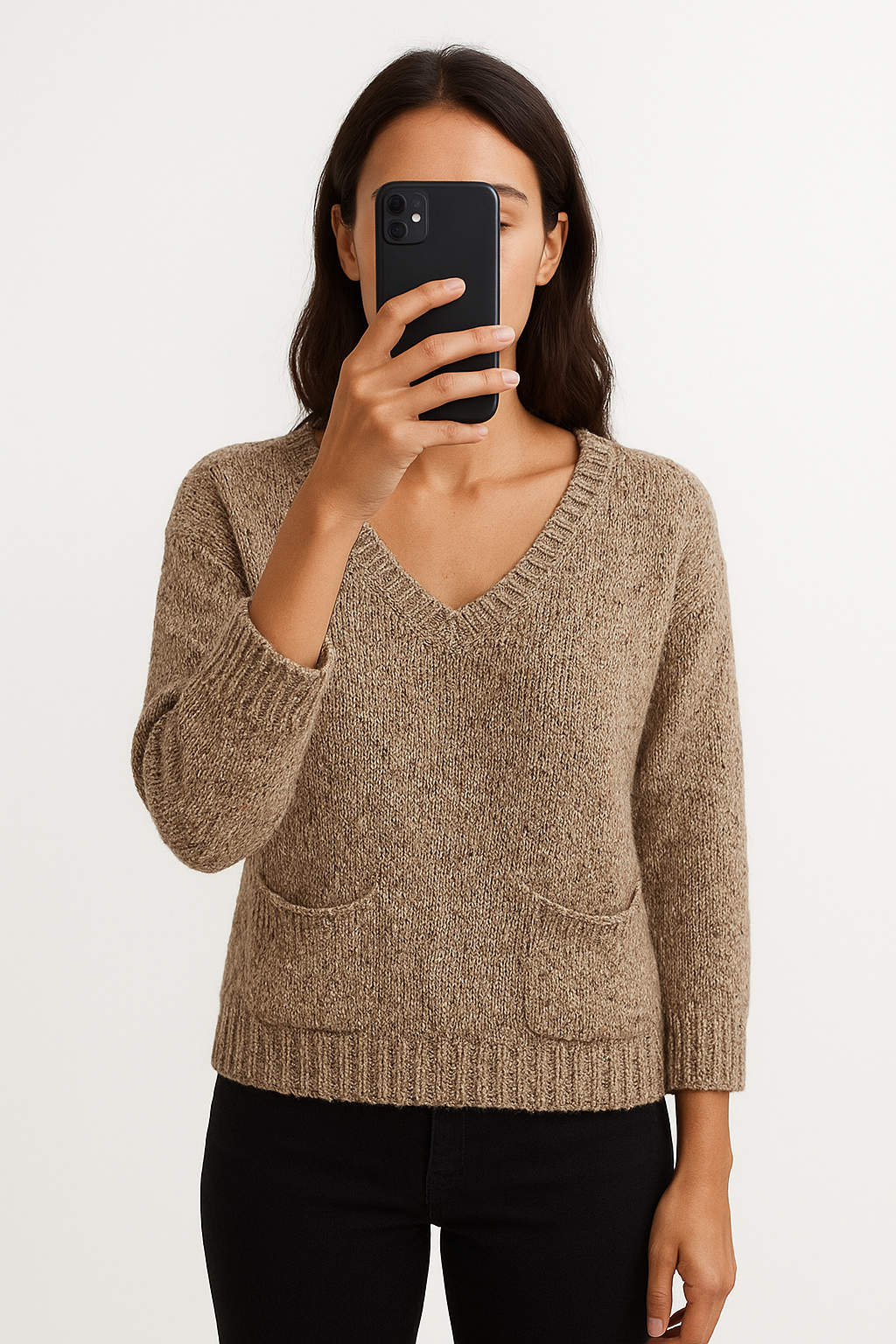 Une personne en Pull promod debout, face à la caméra, avec une silhouette fine, dans un studio photo épuré avec fond blanc et éclairage doux.