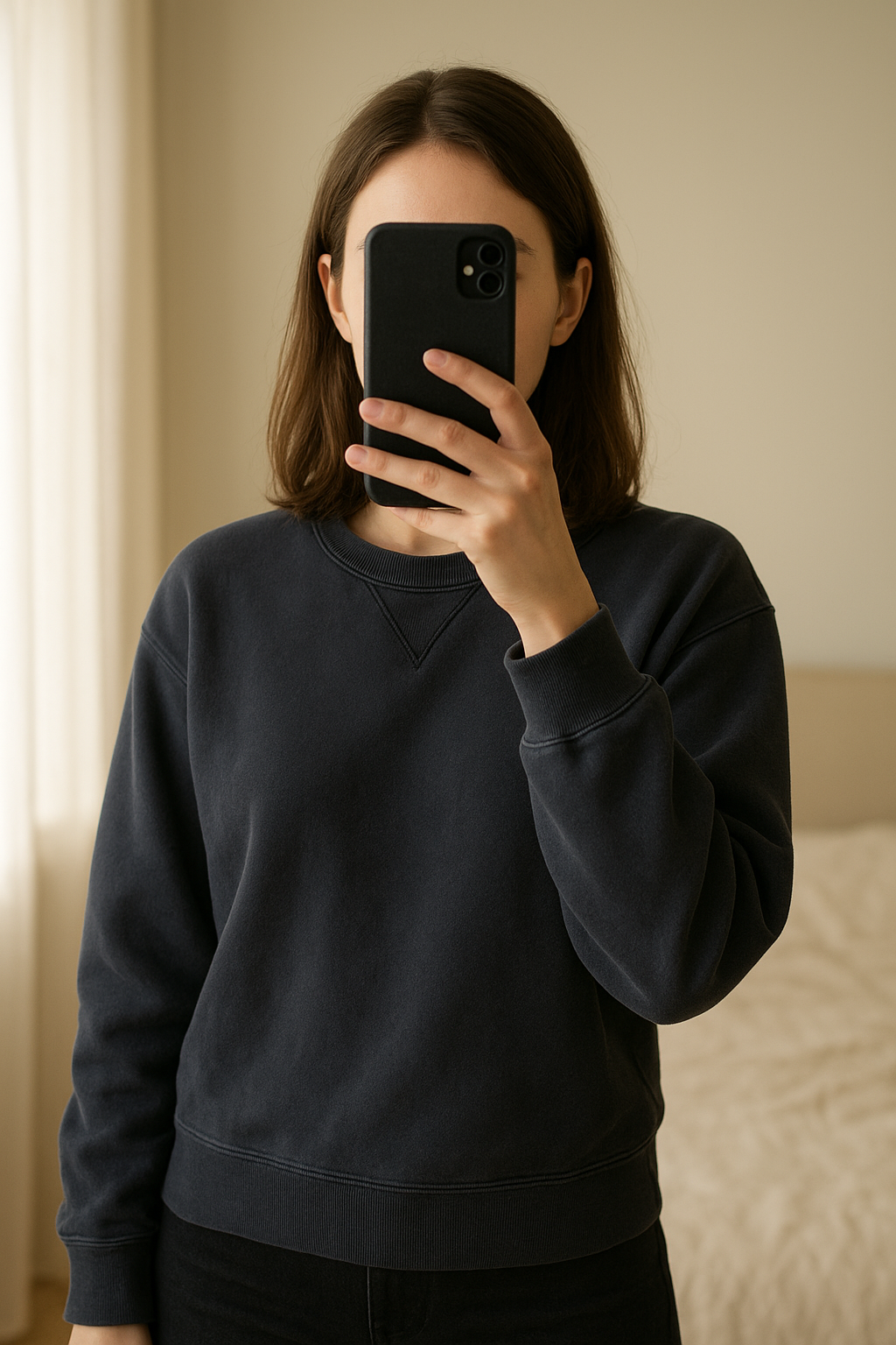 Pull Pull and bear unisexe debout, face à la caméra, dans une chambre à la lumière douce, avec une lumière naturelle filtrant par la fenêtre.