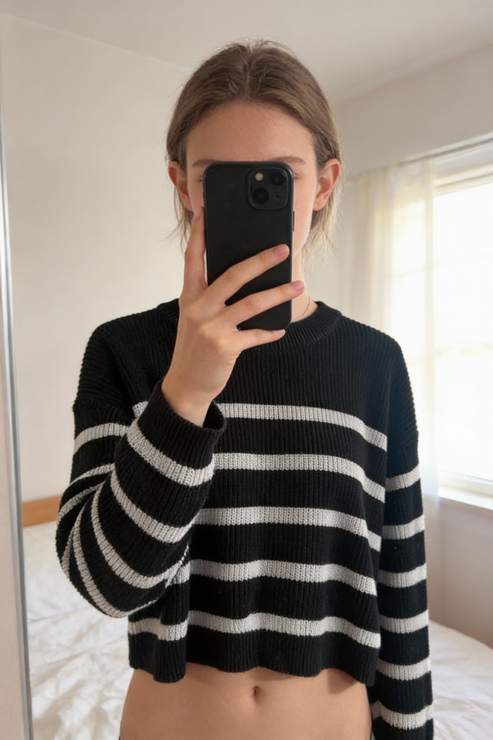 Una persona in Pull à rayures H&M L - Maglione inverno L in piedi, rivolto verso la fotocamera, in una camera da letto con luce soffusa e luce naturale che filtra dalla finestra.