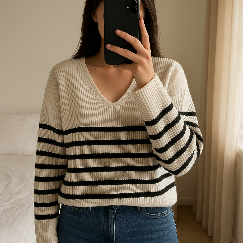 Pull à rayures mango S - Maglione Donna S pullover in piedi, rivolto verso la fotocamera, in una camera da letto con luce soffusa e luce naturale che filtra dalla finestra.
