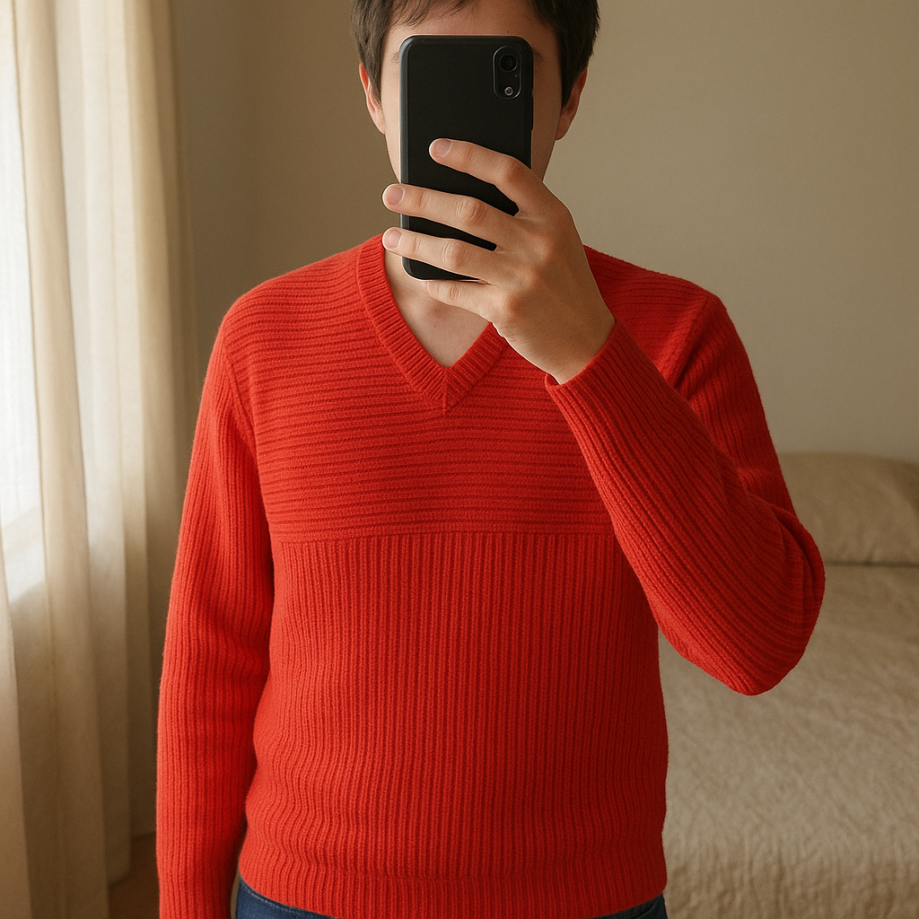 Pull rouge debout, face à la caméra, dans une chambre à la lumière douce, avec une lumière naturelle filtrant par la fenêtre.