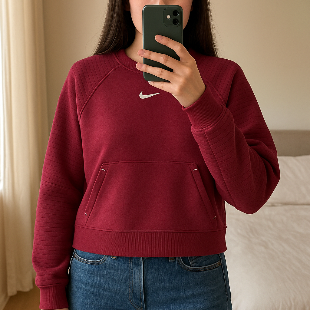 Pull running Nike Pro debout, face à la caméra, dans une chambre à la lumière douce, avec une lumière naturelle filtrant par la fenêtre.