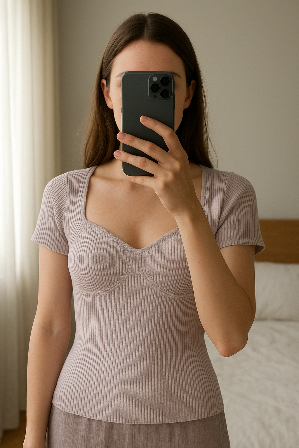 Pull sans manches debout, face à la caméra, dans une chambre à la lumière douce, avec une lumière naturelle filtrant par la fenêtre.