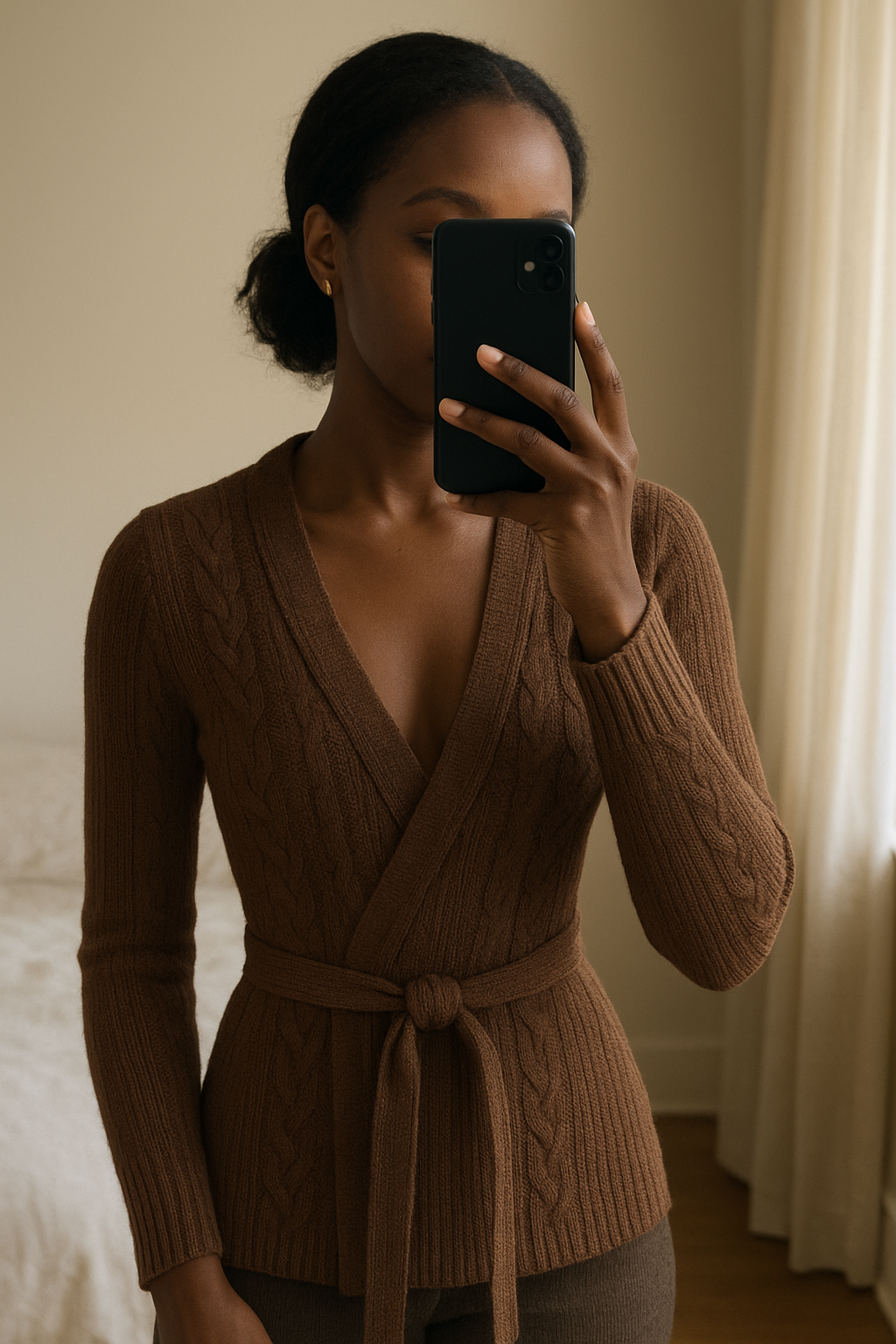 Une personne en pull à torsades encolure V cambrant légèrement le dos pour une pose dynamique, dans une chambre à la lumière douce, avec une lumière naturelle filtrant par la fenêtre.