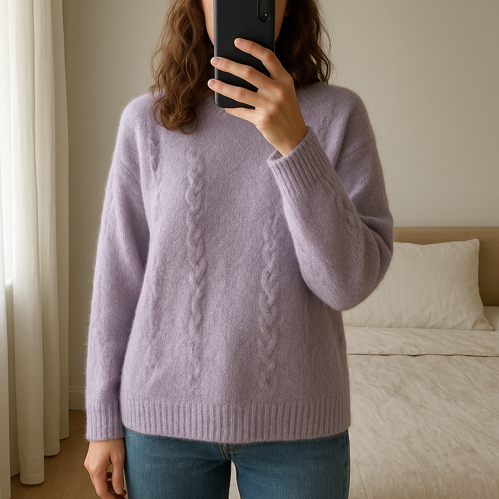 Pull Vintage Handmade maille ajourée Laine Mohair lila pastel Parme - S/M debout, face à la caméra, dans une chambre à la lumière douce, avec une lumière naturelle filtrant par la fenêtre.