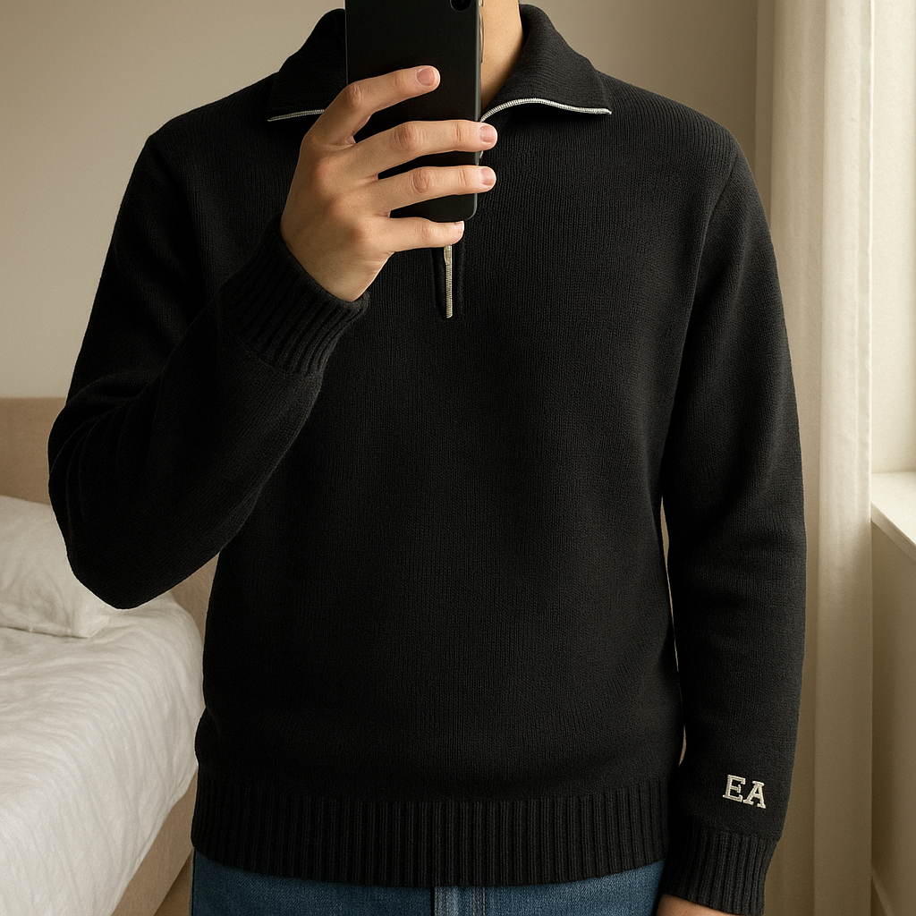 Pull zippé noir en laine Emporio Armani vintage rare – Made in Italy, taille 50 (L) in piedi, rivolto verso la fotocamera, in una camera da letto con luce soffusa e luce naturale che filtra dalla finestra.
