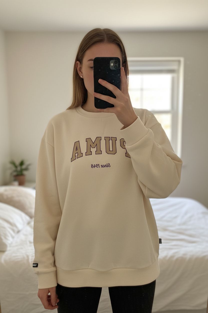 PUMA Cream Sweatshirt - Oversized Vintage Style - Size S Blogger Trend Style in piedi, rivolto verso la fotocamera, in una camera da letto con luce soffusa e luce naturale che filtra dalla finestra.