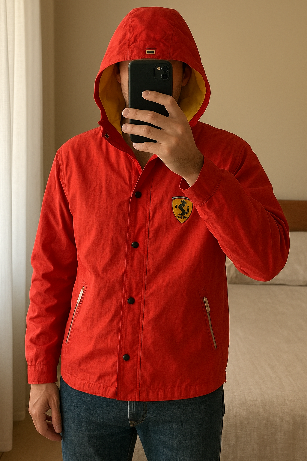 Rare Ferrari F1 Official Licensed 1998 Schumacher Era Windbreaker Jacket Y2K Archive 90s in piedi, rivolto verso la fotocamera, in una camera da letto con luce soffusa e luce naturale che filtra dalla finestra.