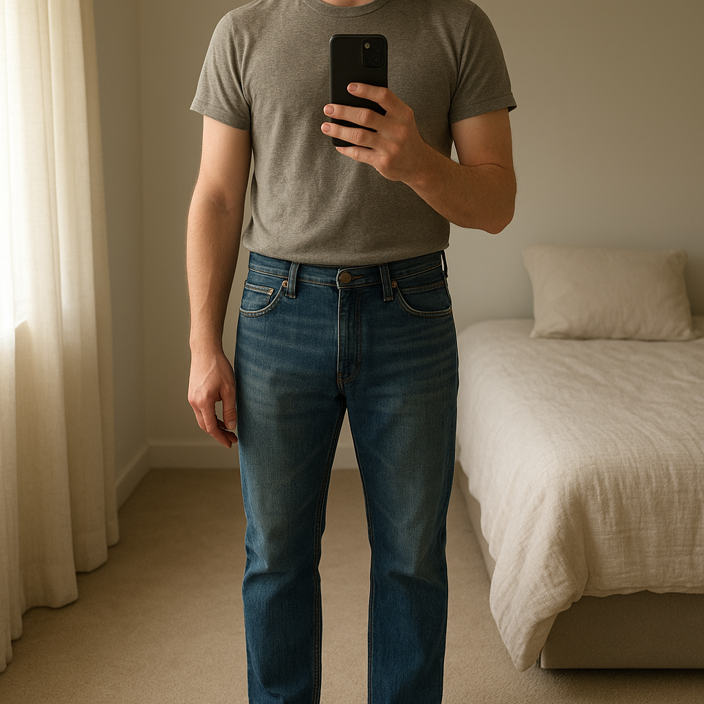 Reply jeans de pie, mirando a la cámara, en un dormitorio con luz suave y natural filtrándose por la ventana.