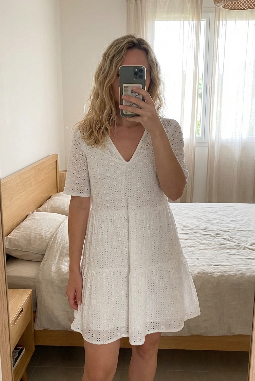 Robe blanche en dentelle IKKS T.40 debout, face à la caméra, dans une chambre à la lumière douce, avec une lumière naturelle filtrant par la fenêtre.
