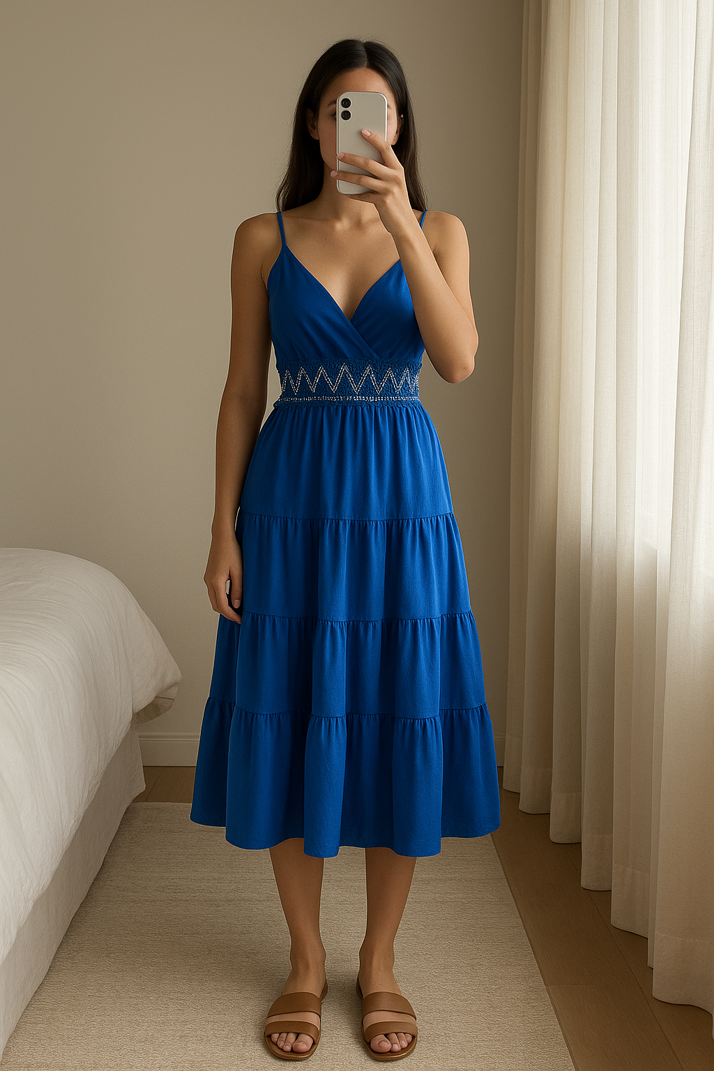 Robe bleu casual été debout, face à la caméra, dans une chambre à la lumière douce, avec une lumière naturelle filtrant par la fenêtre.