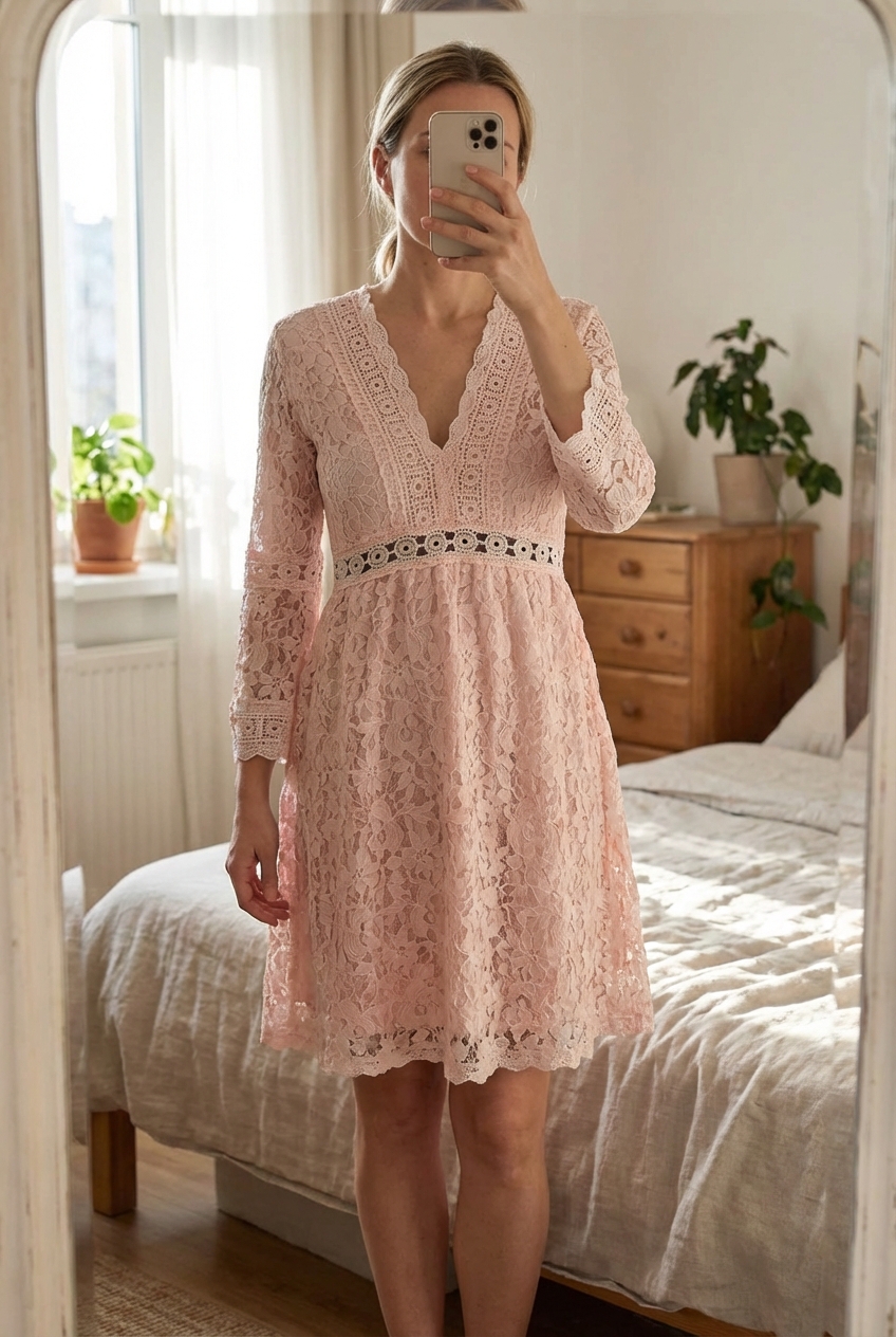 Une personne en Robe bohème dentelle manches longues dos nu - femme - S - May By Shining Star debout, face à la caméra, dans une chambre à la lumière douce, avec une lumière naturelle filtrant par la fenêtre.