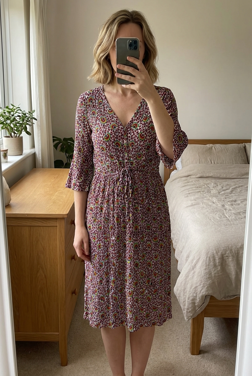 Robe boho debout, face à la caméra, dans une chambre à la lumière douce, avec une lumière naturelle filtrant par la fenêtre.