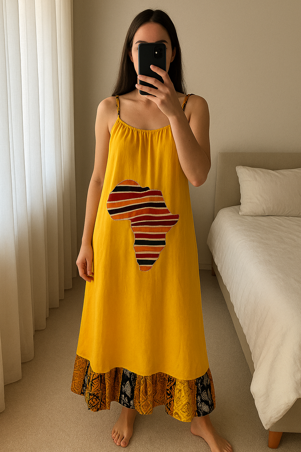 Robe à bretelles jaune avec la carte de l’Afrique debout, face à la caméra, dans une chambre à la lumière douce, avec une lumière naturelle filtrant par la fenêtre.