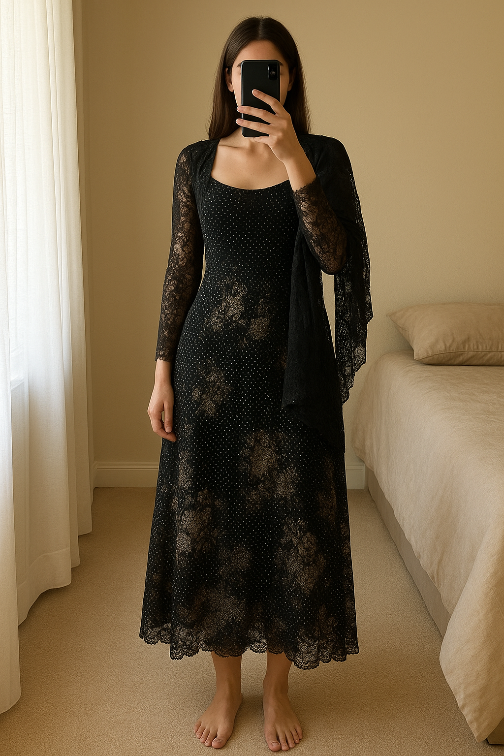 robe chic noir et beige + boléro court manche dentelles transparente debout, face à la caméra, dans une chambre à la lumière douce, avec une lumière naturelle filtrant par la fenêtre.