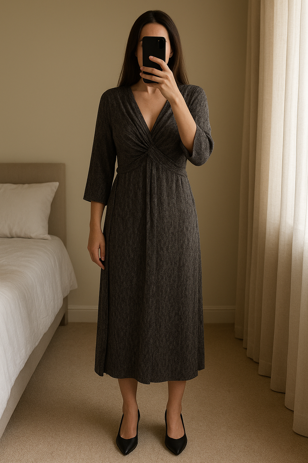 Robe chic noire/argentée Taille 38 debout, face à la caméra, dans une chambre à la lumière douce, avec une lumière naturelle filtrant par la fenêtre.