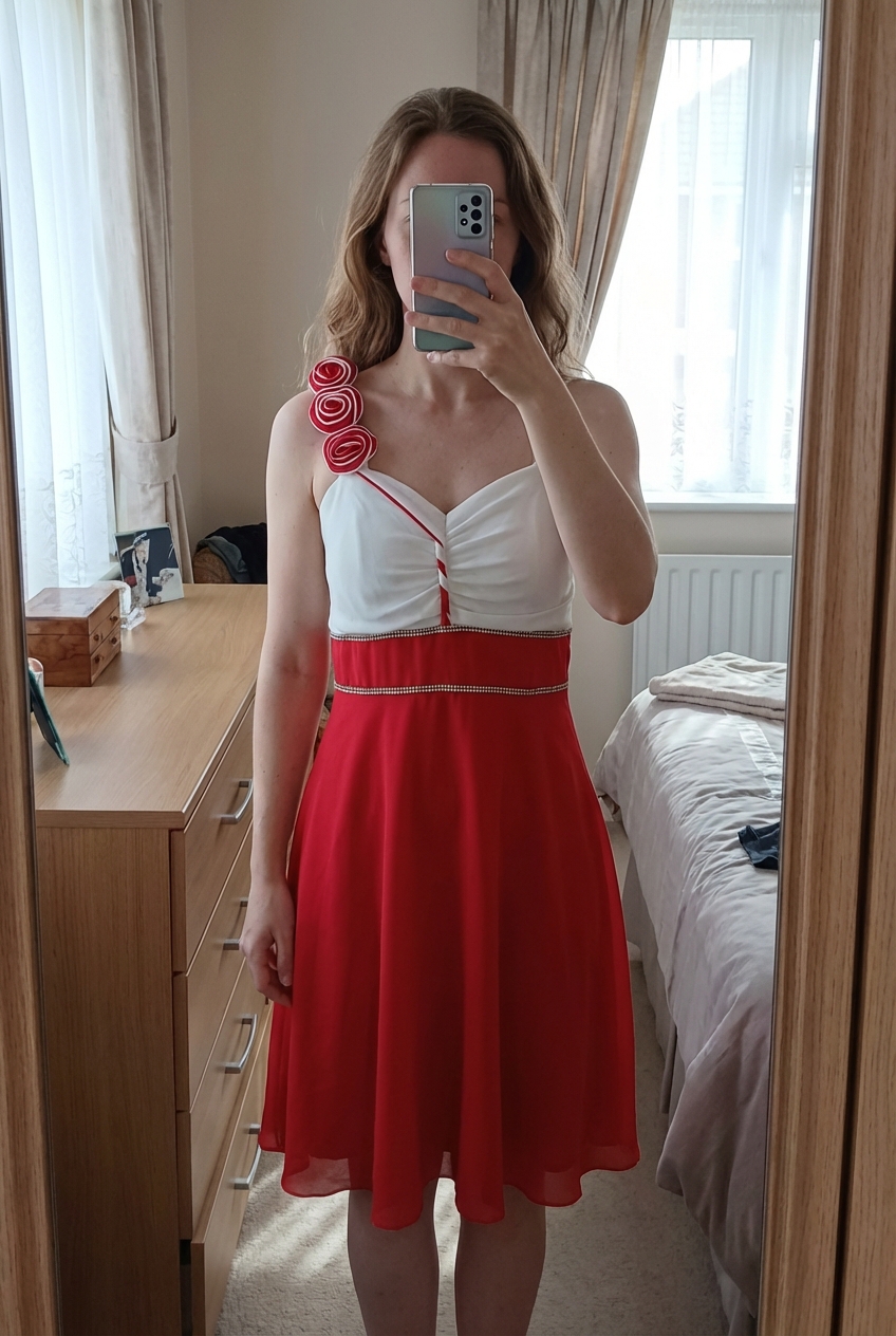 Robe 👗 cocktail 🍸 debout, face à la caméra, dans une chambre à la lumière douce, avec une lumière naturelle filtrant par la fenêtre.