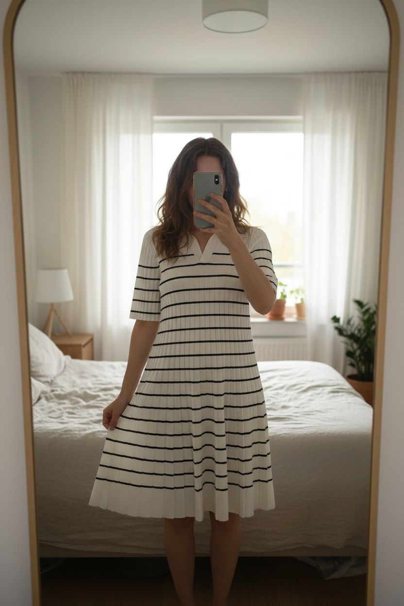 Robe Cos rayée taille S debout, face à la caméra, dans une chambre à la lumière douce, avec une lumière naturelle filtrant par la fenêtre.
