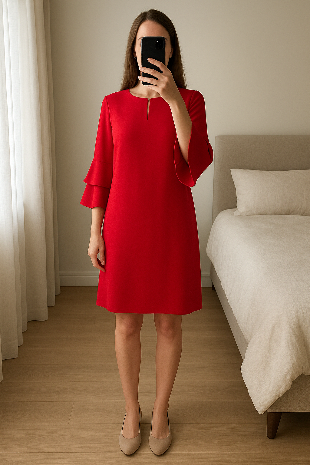 Robe courte Fête Noël Atmosphère debout, face à la caméra, dans une chambre à la lumière douce, avec une lumière naturelle filtrant par la fenêtre.
