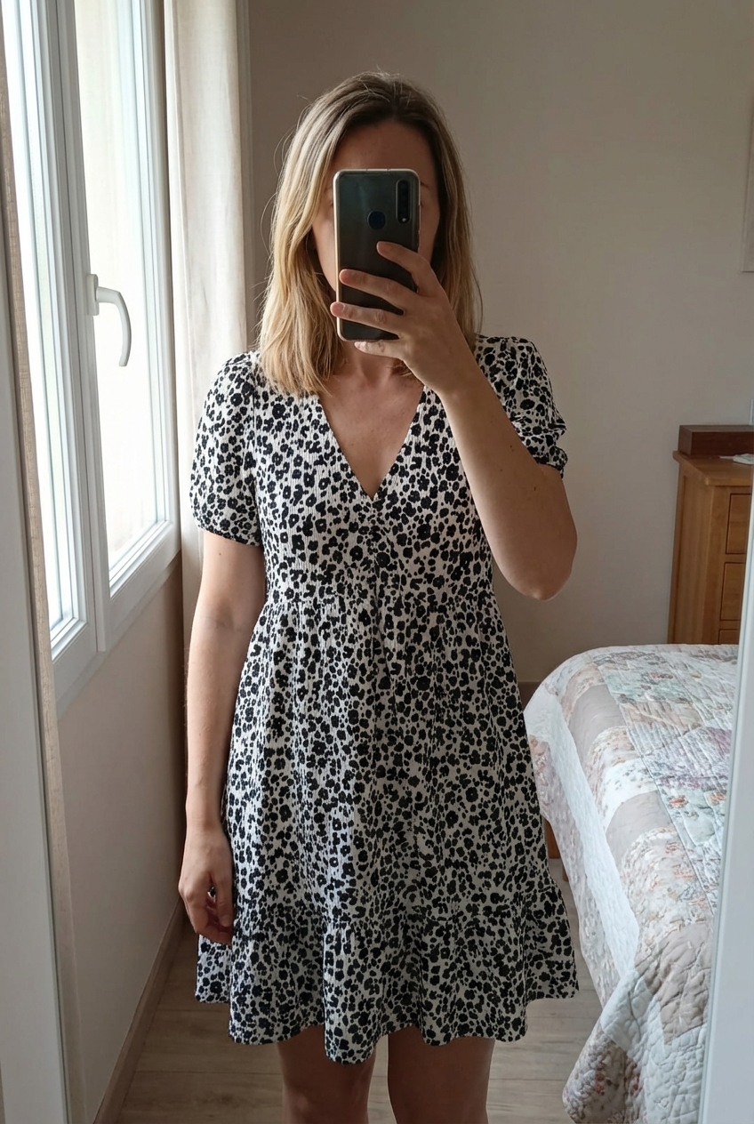 Robe de chez Primark debout, face à la caméra, dans une chambre à la lumière douce, avec une lumière naturelle filtrant par la fenêtre.