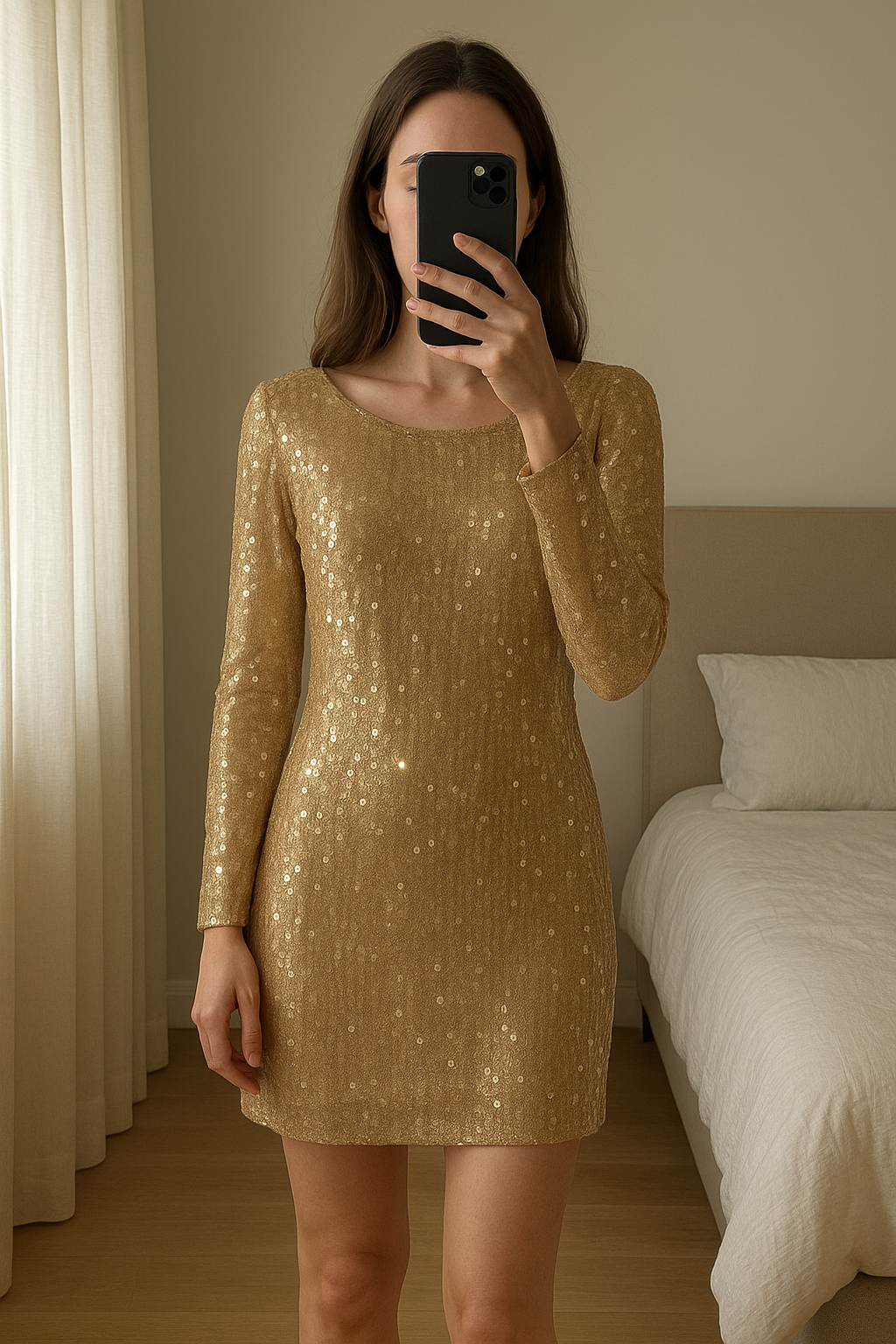 Robe de fête à paillettes manches longues neuve debout, face à la caméra, dans une chambre à la lumière douce, avec une lumière naturelle filtrant par la fenêtre.