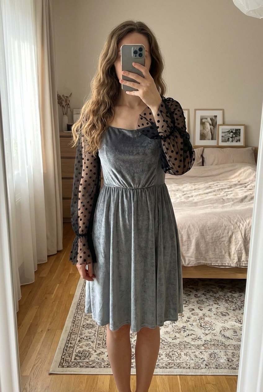 Robe de soirée debout, face à la caméra, dans une chambre à la lumière douce, avec une lumière naturelle filtrant par la fenêtre.