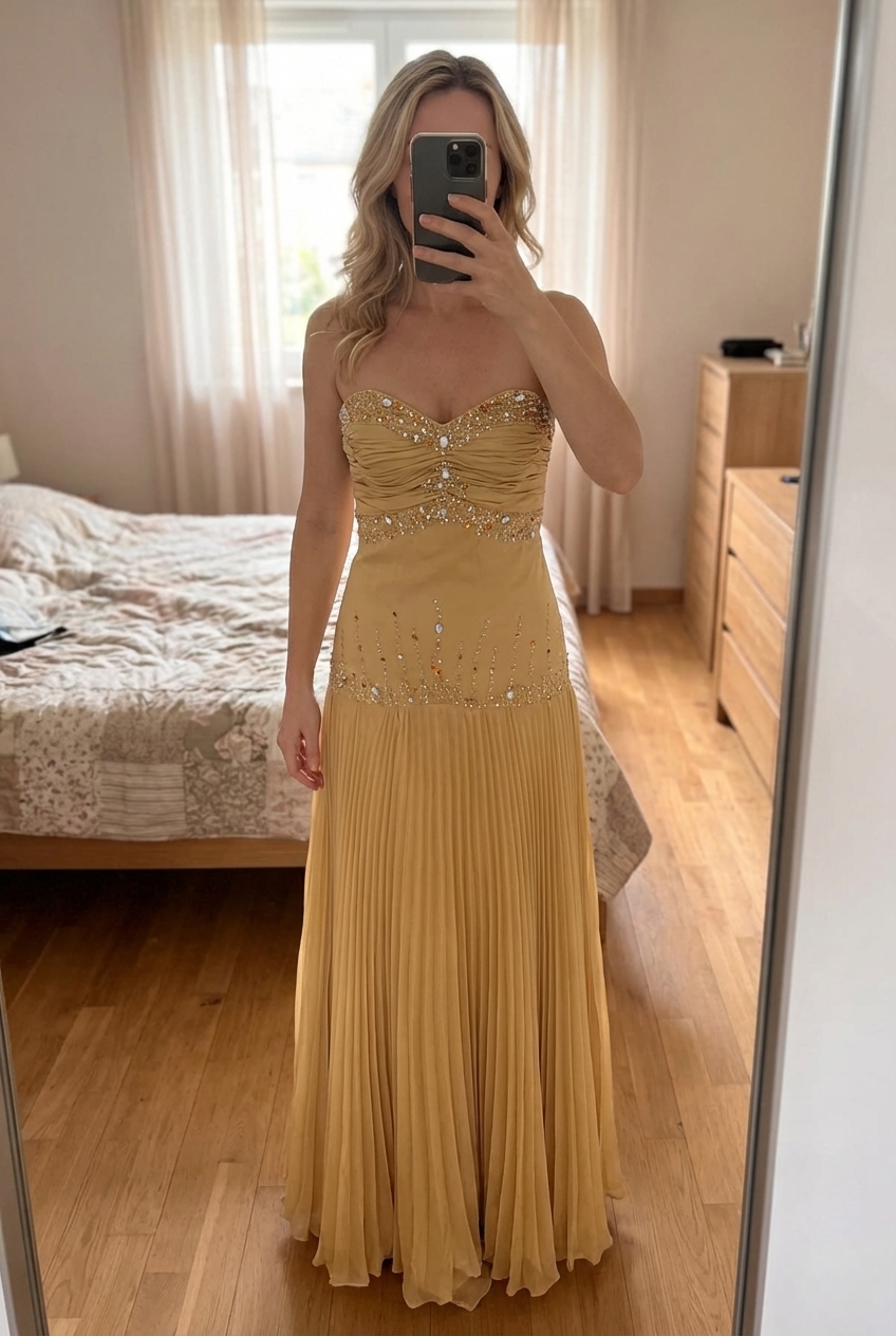 Robe de soirée Moutarde taille S debout, face à la caméra, dans une chambre à la lumière douce, avec une lumière naturelle filtrant par la fenêtre.