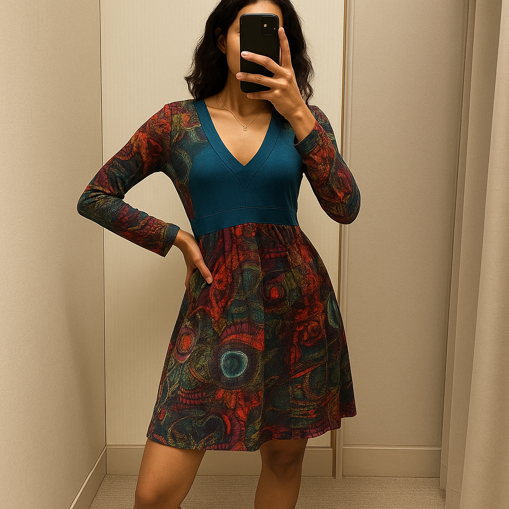 Une personne en Robe Desigual cambrant légèrement le dos pour une pose dynamique, dans une cabine d’essayage de style boutique avec un miroir et une décoration neutre.