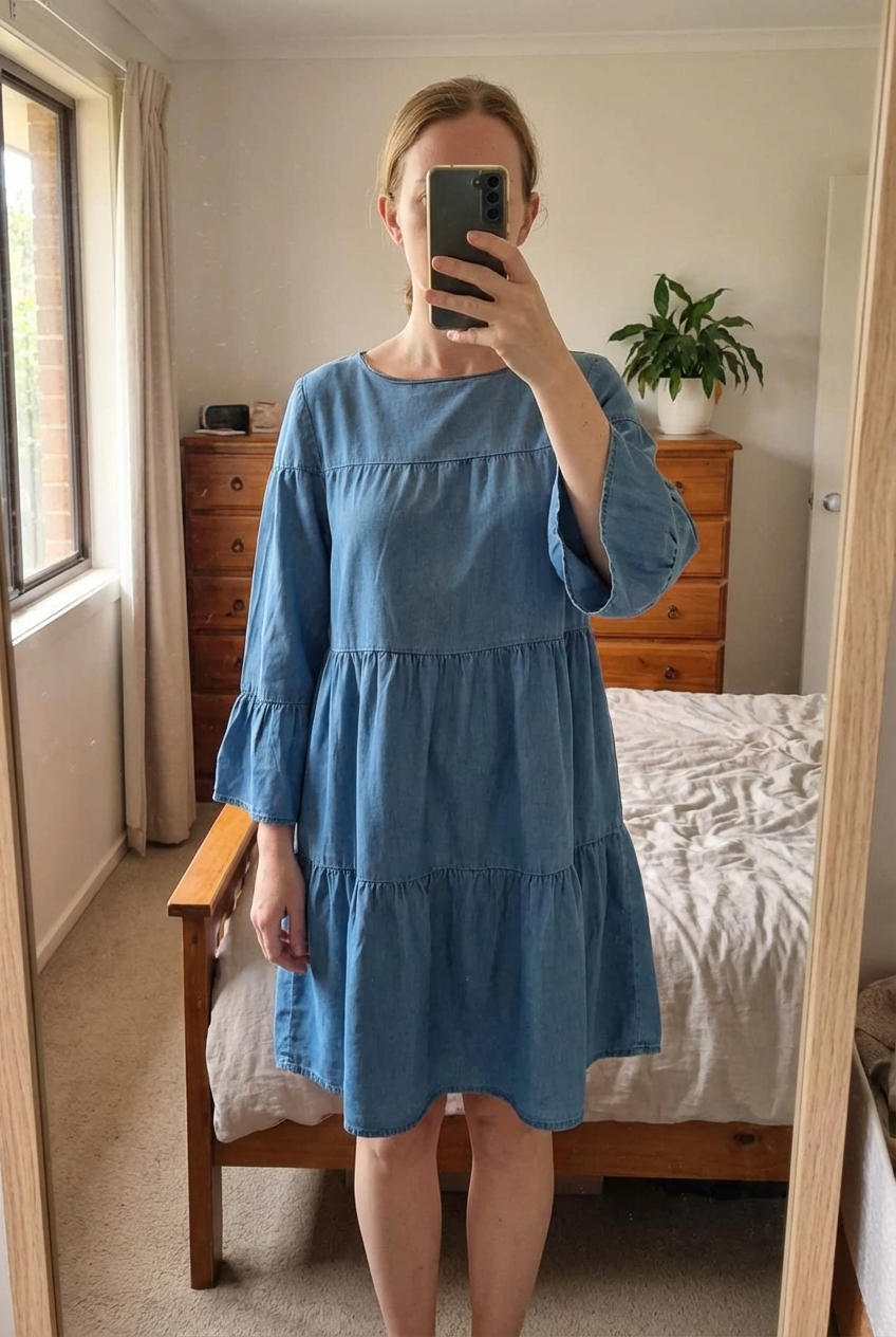 Une personne en Robe en jean - femme - M - Zara Woman debout, face à la caméra, dans une chambre à la lumière douce, avec une lumière naturelle filtrant par la fenêtre.
