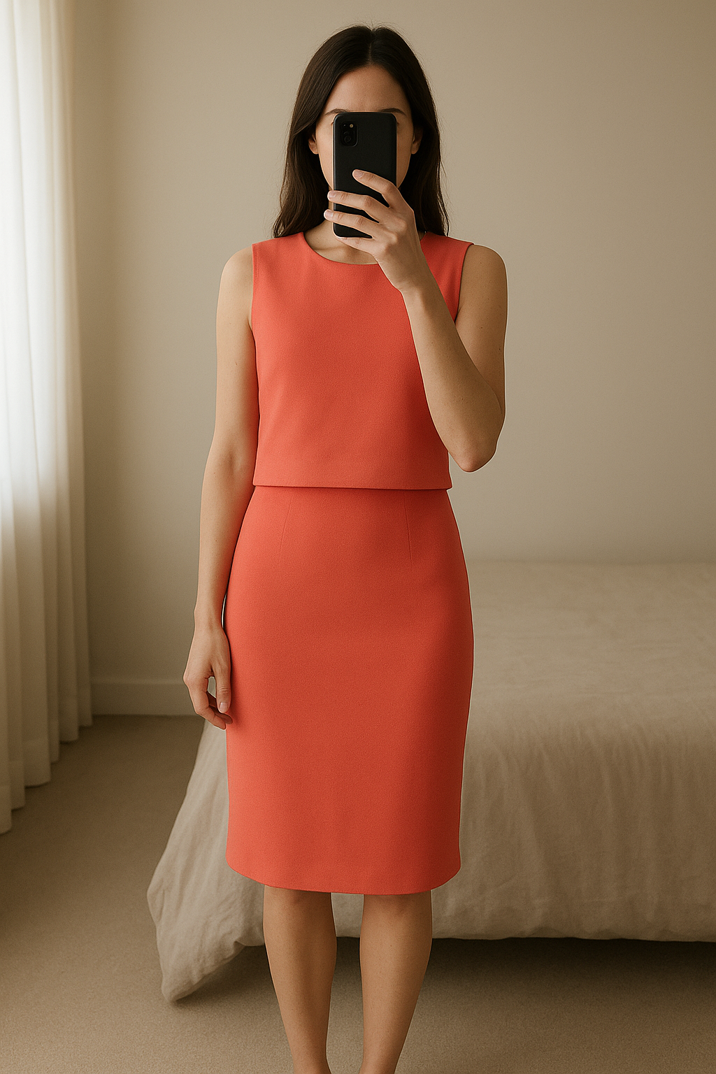 Robe femme avec dos a dentelle debout, face à la caméra, dans une chambre à la lumière douce, avec une lumière naturelle filtrant par la fenêtre.