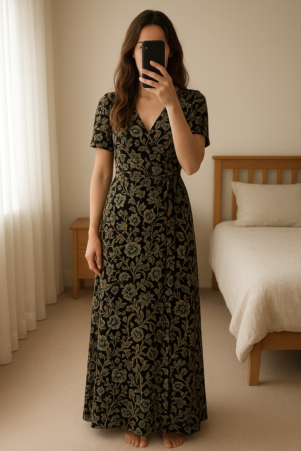 Robe fleurie Orta debout, face à la caméra, dans une chambre à la lumière douce, avec une lumière naturelle filtrant par la fenêtre.