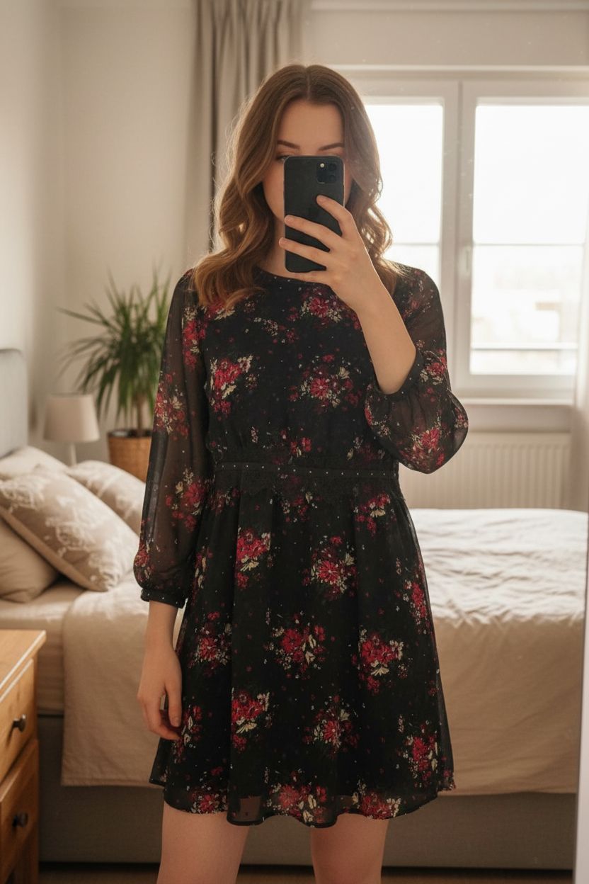 Robe fleurie Zara debout, face à la caméra, dans une chambre à la lumière douce, avec une lumière naturelle filtrant par la fenêtre.